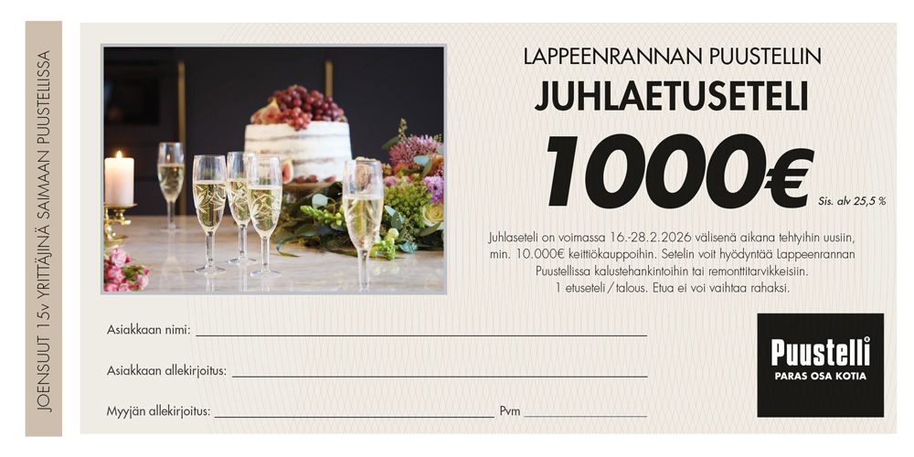 Juhlaseteli on voimassa 16.2.2026 - 28.2.2026 aikana tehtyihin uusiin keittiökauppoihin. Voit hyödyntää juhlasetelin kalustehankintoihin tai remonttitarvikkeisiin.